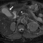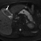 MRI: findings and role in acute cholecystitis. High (800) b-value diffusion-weighted images (d,e) showed visually hyperintense signal in the gallbladder wall (arrows) indicating acute inflammation, and pancreatic gland (*) gradually progressive hypersignal consistent with oedematous acute pancreatitis from tail to head.