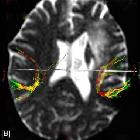 importance of fMRI and DTI in the presurgical planning of multicentric low-grade gliomas: a case report.. Axial FA colour-mapping images (A-D). The tumours, located at the right temporal and left frontotemporal regions, are visualized as a well-circumscribed bluish area, which is characteristic of low fractional anisotropy.