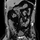 mit in diese hineinziehende Appendizitis: De-Garengeot-Hernie. Computertomographie axial und coronar. Das entsprechende Pendant in einer Leistenhernie heißt Amyand-Hernie.