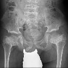 Dysplasie Typ Koslowski: Röntgenbild des Beckens mit Darstellung der deformierten Femurmetaphysen. Platyspondylie der mit erfassten unteren Wirbel.