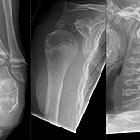Dysplasie Typ Koslowski: Röntgenbilder beider Sprunggelenke, der rechten Schulter sowie der HWS und LWS seitlich. Man sieht die deformierten Metaphysen sowie ausgeprägte Platyspondylie der Wirbel.
