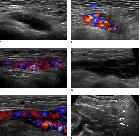 Ligamentum teres uteri in der Schwangerschaft (32. Schwangerschaftswoche). Es zeigen sich varikös veränderte, spongiforme Gefäßkonvolute im Leistenkanal bis an die V. femoralis heranreichend. Im Farbdoppler waren kräftige Flusssignale darstellbar. Der Befund darf nicht mit einer Leistenhernie verwechselt werden.