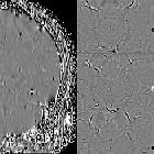 Phasen-Bild SWI mit Aliasing: Der Befund ist so groß, das nur im kranialen und kaudalen Anteil der Läsion das echte Signal des Hämosiderins (Philips- MRT: Schwarz) zur Darstellung kommt, während zentral in der Läsion durch Aliasing ein helles / weißes Signal entsteht.