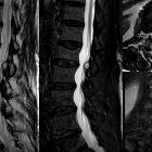 epidurale, eingeblutete Synovialzyste Facettengelenk mit akuter Klinik mit Schmerz und Kaudasymptomatik. Oben sagittal T1 nativ (hell !), T2, STIR, unten T2 axial , T1 KM FS axial und sagittal.