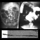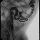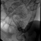 Contrast enema may demonstrate a small caliber to the left colon with multiple filling defects within due to retained meconium. The rectum is usually normal in size, unlike Hirschsprung disease. The use of high osmolar ionic contrast media for enema in a neonate or infant is controversial due to the risks associated with fluid shift . The enema can be both diagnostic as well as therapeutic and is usually accompanied by the passage of meconium during or after the procedure.