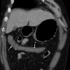 shock with subtle imaging signs: systemic capillary leak syndrome. Diffuse, moderate circumferential mural thickening (thin arrows) with mucosal enhancement and mural hypoattenuation suggesting submucosal oedema. Note marked nephrogram, slit-like inferior vena cava (arrow).