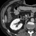 shock with subtle imaging signs: systemic capillary leak syndrome. Most of the collapsed colon showed diffuse, moderate circumferential mural thickening (thin arrows) with mucosal enhancement and mural hypoattenuation suggesting submucosal oedema.
