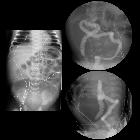 failure to pass meconium. AXR (left) shows multiple dilated loops of bowel with an extremely dilated loop of bowel in the lower abdomen. AP (above right) and lateral (below right) images from an enema show a microcolon with contrast reaching the level of the cecum but not refluxing the terminal ileum, despite multiple attempts. The diagnosis was colonic atresia.