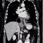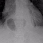 herniation of Nissen fundoplication. Retrocardiac structure completely surrounding the distal oesophagus, aparently in continuity with the gastric fundus. The rest of the gastric chamber was located infradiaphragmatic.