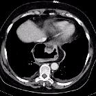 herniation of Nissen fundoplication. Upper gastrointestinal series demonstrated a filiform pass of barium along the distal oesophagus at the level of the structure, with slight dilatation of the proximal portion.