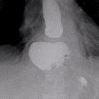 had a Nissen fundoplication for gastroesophageal reflux a year ago who is now retching with feeding. AP (left) and lateral (right) images from an upper GI exam show the Nissen fundoplication wrap to be intact around the fundus of the stomach. However, part of the stomach has herniated above the level of the wrap.The diagnosis was Nissen fundoplication malfunction in the form of a para-Nissen herniation.