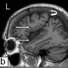 symmetrical perisylvian polymicrogyria.. Sagittal (a,b) and coronal (c) T1-weighted images show that polymicrogyria involves the entire perisylvian cortex (arrows) and extents posteriorly to the central sulcus (curved arrows).