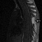 of acute paraplegia: granulocytic sarcoma. Sagittal spinal cord MRI T1: complete regression of compression process (the epidural mass was completely resected) with stigmata of laminectomy D6 (arrow)