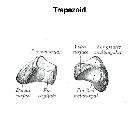 The trapezoid is an irregular, boot-shaped bone. The dorsal surface is larger than the palmar surface and is elongated in the transverse direction. It has a smaller square-shaped palmar surface projecting out of the larger dorsal portion. The palmar surface connects to the dorsal portion slightly laterally. The distal surface is triangular, with a palmar apex. The distal articulation surface has two small concave facet surfaces medially and laterally, with an overall convex appearance. The medial and lateral surfaces are both narrow, with the medial surface concave and the lateral surface convex in appearance.