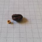 tympanostomy tube next to a coffee bean for scale. Squares on paper have an edge length of 5mm.