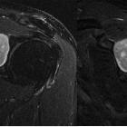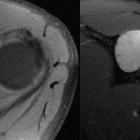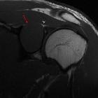 schwannoma mimicking a bone tumour. Isointense well-defined mass with epicentre in the spinoglenoid notch (red arrow). Note the close relationship with the suprascapular nerve (white arrow).