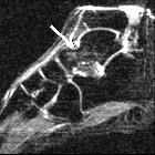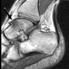 injury of the ankle in professional ballet dancers seen on MRI. Talar bone marrow edema in a symptomatic 24-year-old male (same subject as in figure 1). Sagittal T1-weighted (TR/TE = 380/18) MR image shows patchy low signal within the talus (arrow).