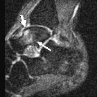 injury of the ankle in professional ballet dancers seen on MRI. Sagittal STIR MR image of a 25-year-old male shows patchy edema signal within the body of the talus (long arrow), which extends to the subchondral region of the talar dome (short arrow). This same edema pattern was observed in nine of the twelve ankles and may be related to chronic repetitive stress.
