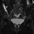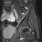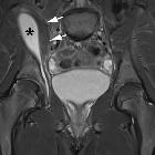 hematoma of the ilium: an unusual complication of acetabular fracture. A large subperiosteal hematoma of the iliac bone (asterisk) appears as a hyperintense, lens-shaped lesion delimited between the internal aspect of the right iliac bone and the right iliacus muscle (arrows), which is shifted medially.