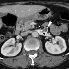 left renal vein aneurysm with thrombosis. Multiplanar reformatted images (b..d) from portal venous phase acquisition depicted the lesion (arrowheads) as a saccular outpouching of the left renal vein (*), with internal nonenhancing tissue (thin arrows) representing intraluminal thrombus.