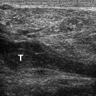 aneurysmal dilatation of the hypogastric vein. 5 years earlier, longitudinal (a) and transverse (b,c) ultrasound images showed chronic deep venous thrombosis (T) of the right lower limb, from the popliteal to the common femoral vein.